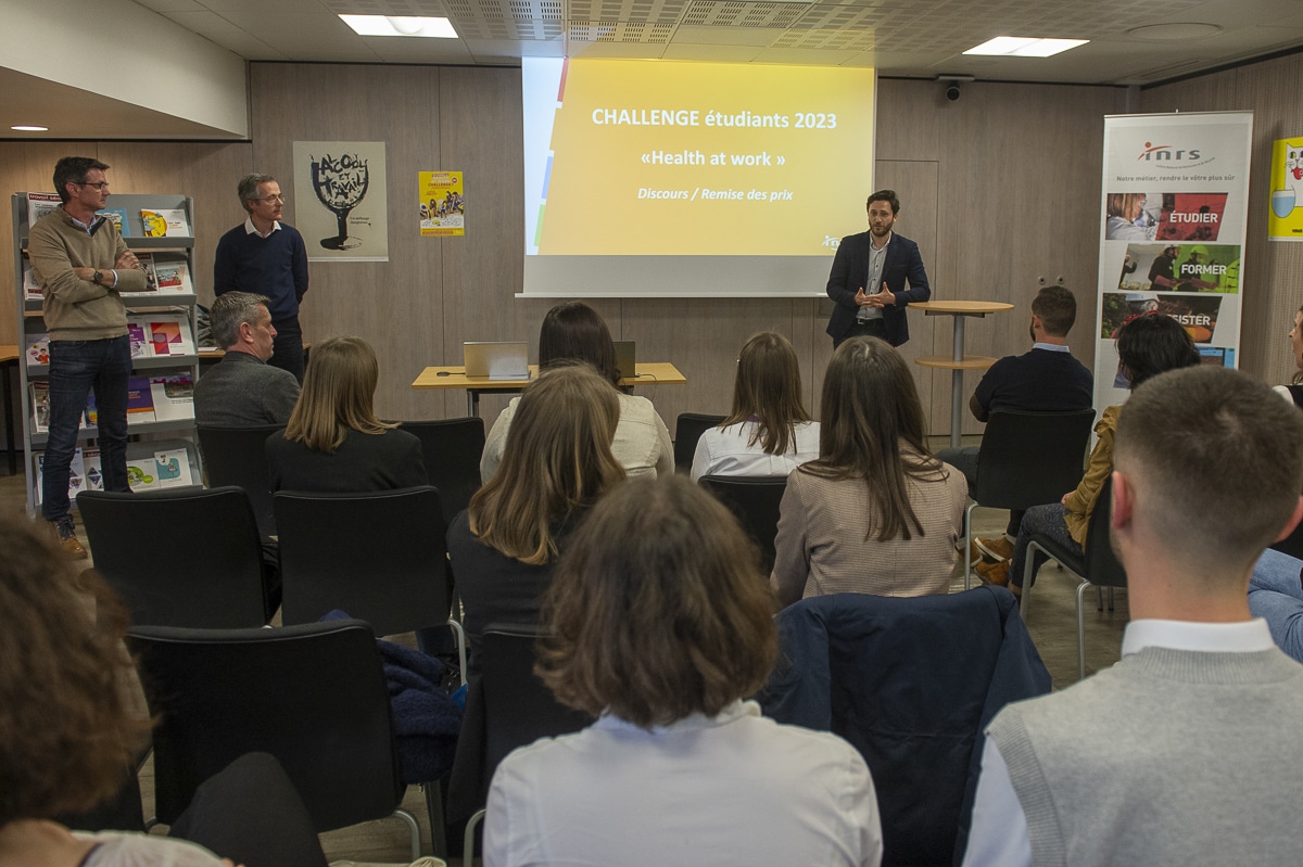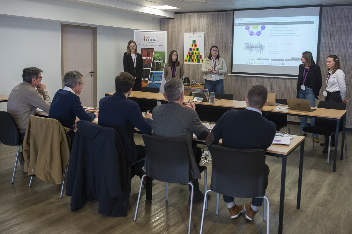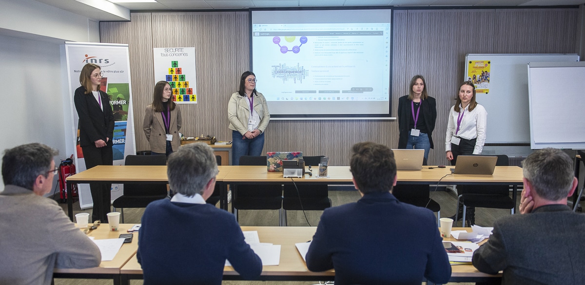 A l’issue de cette première phase de qualification, les trois équipes gagnantes ont pu présenter leur projet en finale, le jeudi 16 mars, dans les locaux de l’INRS à Paris, afin de tenter de gagner le premier prix. Les 3 équipes devaient alors réaliser un « support visuel original » et le présenter devant un jury, comme vous ils pourraient le faire en entreprise, face à un comité de direction ou de pilotage, pour défendre un projet.